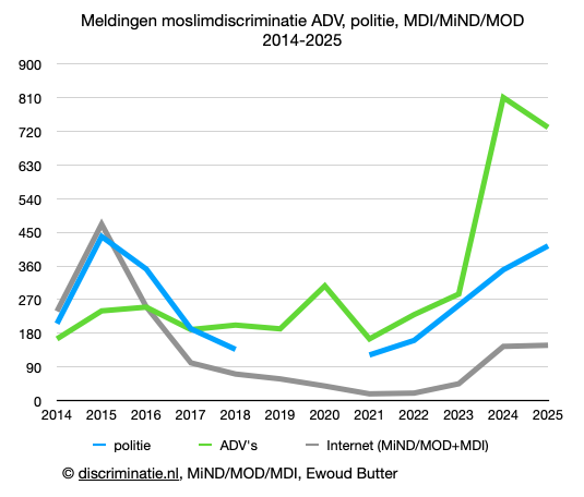 Van alle meldingen die ADV's in 2025 ontvingen, ging het in 6,7 procent van de gevallen om moslimdiscriminatie. Ook dat was een record sinds moslimdiscriminatie wordt geregistreerd.